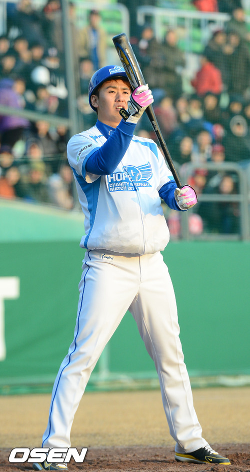 2일 오후 수원야구장에서 열린 국내 프로야구 최초의 자선경기 ‘HOPE+ Charity Baseball Match’ (희망더하기 자선 야구대회 2012)에서 통일팀이 평화팀에 6-5로 승리를 거뒀다. 9회말 윤희상이 이대호를 흉내내고 있다.
