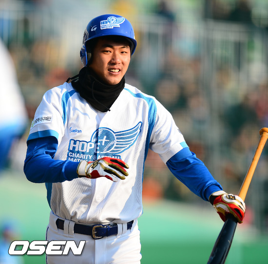 2일 오후 수원야구장에서 열린 국내 프로야구 최초의 자선경기 ‘HOPE+ Charity Baseball Match’ (희망더하기 자선 야구대회 2012)에서 통일팀이 평화팀에 6-5로 승리를 거뒀다. 김광현이 홈에서 아웃 당한 후 덕아웃으로 들어오고 있다.