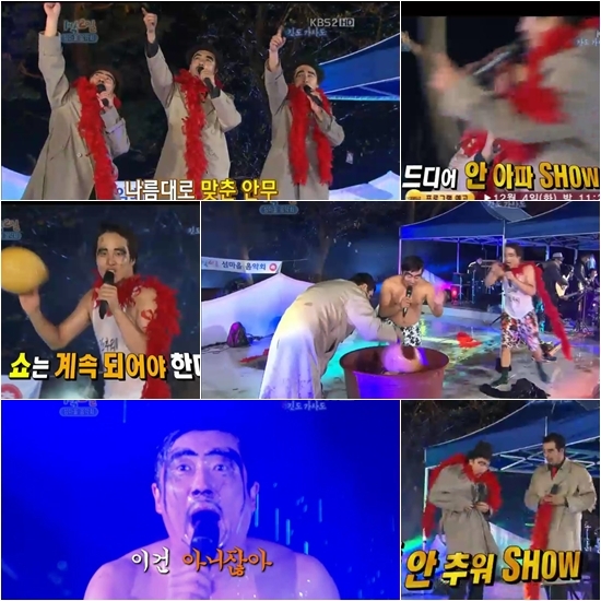 이어서 벌어진 쇼는 바로 ‘안 추워 쇼’. 차태현은 옷을 벗기 시작했고 결국 물까지 끼얹으며 “안 추워”를 연발했다. 이어서 물이 담긴 곳에 세 사람이 연속으로 들어가 화장이 지워지는 등 무대가 초토화가 돼 큰 웃음을 선사했다.