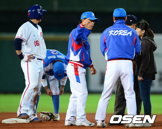 2일 오후 대만 타이중 인터컨티넨탈구장에서 열린 '제26회 아시아야구선수권대회' 한국과 대만의 경기 4회말 1사 2,3루 조우쓰지의 2타점 2루타 상황, 이연수 감독이 2루에서 아웃이 아니냐며 2루심에게 항의를 하고 있다.