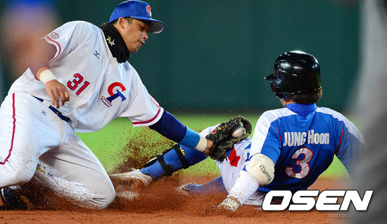 2일 오후 대만 타이중 인터컨티넨탈구장에서 열린 '제26회 아시아야구선수권대회' 한국과 대만의 경기 5회초 1사 정훈이 좌전안타를 치고 2루까지 쇄도 했지만, 아웃당하고 있다.