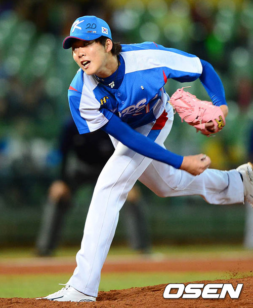 2일 오후 대만 타이중 인터컨티넨탈구장에서 열린 '제26회 아시아야구선수권대회' 한국과 대만의 경기 5회말 1사 만루 교체된 정인욱이 역투하고 있다.