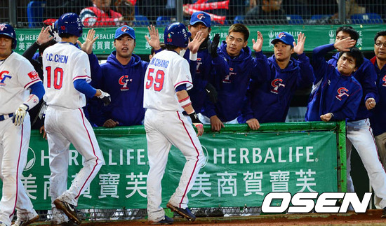 2일 오후 대만 타이중 인터컨티넨탈구장에서 열린 '제26회 아시아야구선수권대회' 한국과 대만의 경기 5회말 1사 만루 조우쓰지의 2타점 적시타에 홈을 밟은 대만 선수들이 덕아웃에서 동료들과 하이파이브를 하고 있다.