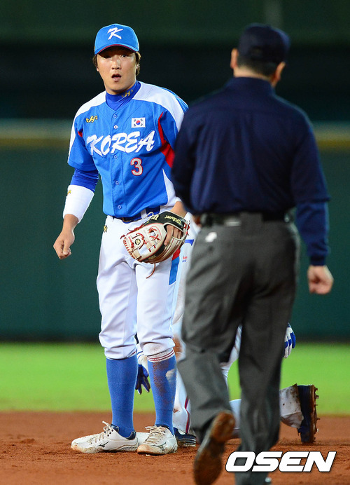 2일 오후 대만 타이중 인터컨티넨탈구장에서 열린 '제26회 아시아야구선수권대회' 한국과 대만의 경기 4회말 1사 2,3루 조우쓰지의 2타점 2루타 상황, 조우쓰지의 2루에서의 세이프 판정에 정훈이 심판에게 항의하고 있다.