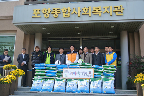 포항 스틸러스 선수단이 지난달 30일 오후 포항시 소재 4개 기관을 각각 방문해 사랑 나눔 쌀 기부 행사를 실시했다.