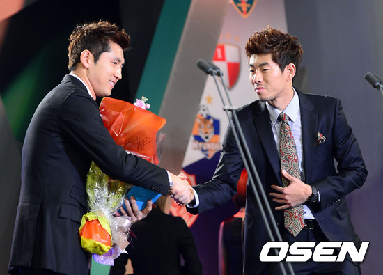 3일 오후 서울 홍은동 그랜드힐튼호텔 컨벤션센터에서 열린 '2012 현대오일뱅크 K리그' 시상식에서 베스트11 Gk에 선정된 FC서울 김용대가 하대성의 축하을 받고 있다.