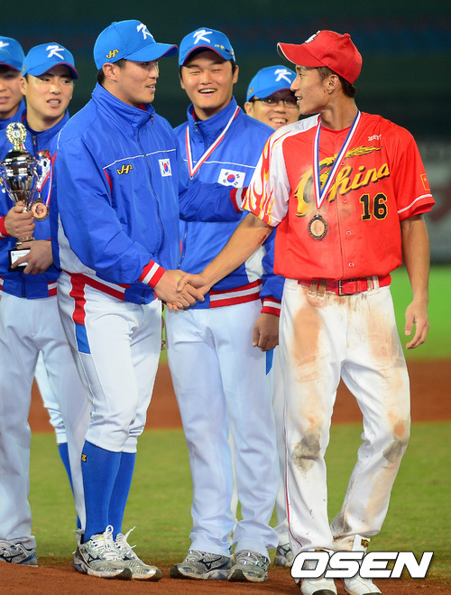3일 오후 대만 타이중 인터컨티넨탈구장에서 열린 '제26회 아시아야구선수권대회' 폐막식에서 이영욱이 한 중국 선수에게 자신의 동메달을 목에 걸어준 후 인사를 나누고 있다.