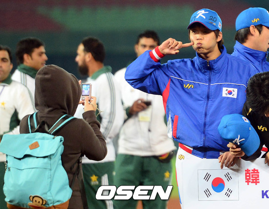 3일 오후 대만 타이중 인터컨티넨탈구장에서 열린 '제26회 아시아야구선수권대회' 폐막식에서 정인욱이 기념촬영을 하고 있다.