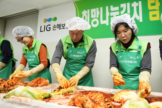 LIG손해보험은 매년 12월 전 직원들이 봉사활동에 참여하는 '희망봉사 한마당'을 개최하고 있다. 올 해는 3일 임직원들이 한자리에 모여 1500포기의 김장을 직접 담갔다. 그리고 그 중 500포기를 배구단 연고지인 구미시 소재 노인시설단체에 기부하여 이웃들의 따뜻한 겨울을 도울 계획이다.