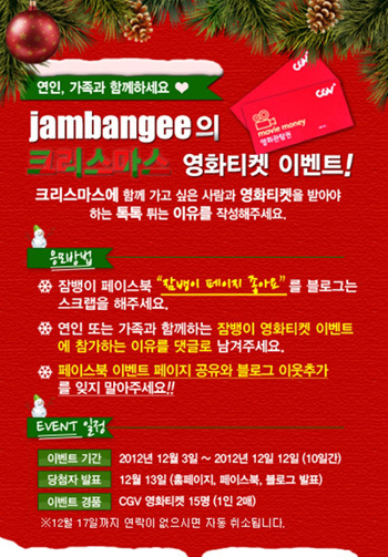 3일부터 10일간 진행되는 잠뱅이의 크리스마스 영화티켓 이벤트는 잠뱅이 페이스북에 ‘좋아요’를 누른 후 크리스마스에 함께 가고 싶은 사람과 영화티켓을 받아야 하는 이유를 개성과 진심을 담아 댓글로 남기면 된다.