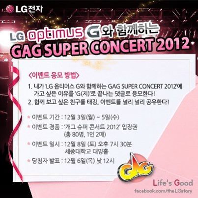 12월 3일부터 5일까지 진행되는 이번 이벤트는 ‘LG 옵티머스 G와 함께하는 개그 슈퍼 콘서트 2012’에 가고 싶은 이유에 대해 ‘G(지)’로 끝나는 댓글을 LG전자 페이스북(https://www.facebook.com/theLGstory)에 올리면 된다. 또한 함께 보고 싶은 친구를 태깅해 이벤트 내용을 친구와 공유하면 응모 완료된다.
