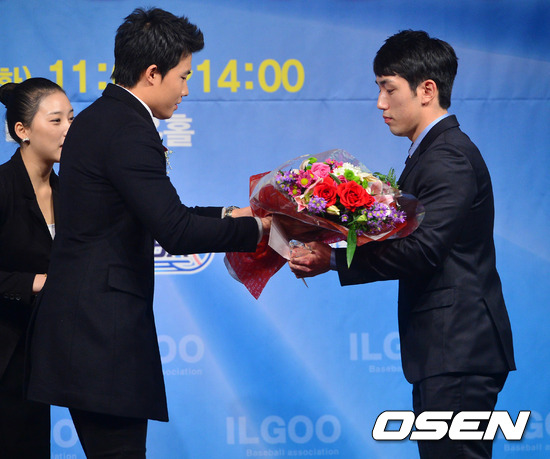 신인상을 수상한 넥센 서건창이 LG 임찬규에게 트로피와 꽃다발을 건네받고 있다.