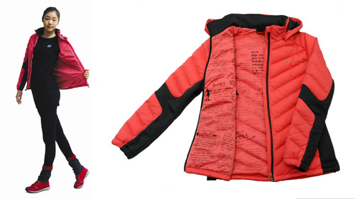 김연아 선수는 팬들의 따뜻한 마음과 정성이 가득 담긴 응원 슬림다운을 착용하고, 직접 인증샷을 찍어 공개했으며, 특유의 차분하고 상큼한 표정과 자신감 넘치는 모습을 보여줘 팬들의 마음을 훈훈하게 만들었다. 또한 슬림다운 재킷 안에 새겨진 메시지 하나하나를 꼼꼼히 읽고, 응원해준 많은 팬들에게 감사의 뜻을 전했다.
