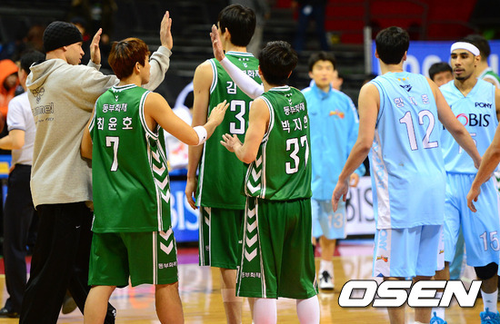 경기 후 동부 선수들이 승리의 기쁨을 나누고 있다./sunday@osen.co.kr
