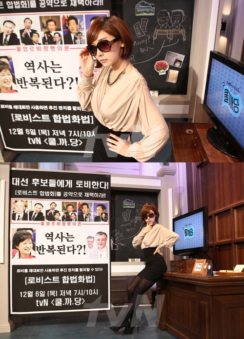 곽현화는 오는 6일 방송되는 tvN 시사토크쇼 '쿨까당'에서 로비스트의 대명사 린다 김을 연상케하는 검은 선글라스와 늘씬한 몸매가 드러나는 옷을 입고 등장, 도발적인 로비스트의 모습을 재연했다.