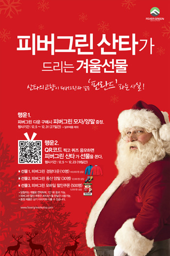 또한 23일까지 이벤트 포스터, 리플렛 또는 영수증 상의 이벤트 QR코드를 스마트폰으로 접속해 ‘피버그린 퀴즈’에 응모하면 피버그린 산타가 드리는 푸짐한 선물이 쏟아진다.