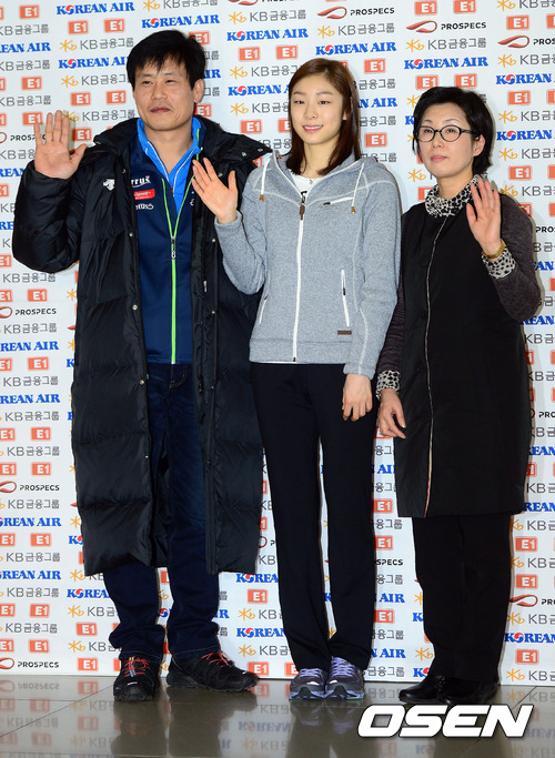 출국에 앞서 김연아가 류종현, 신혜숙 코치와 포토타임을 갖고 있다.