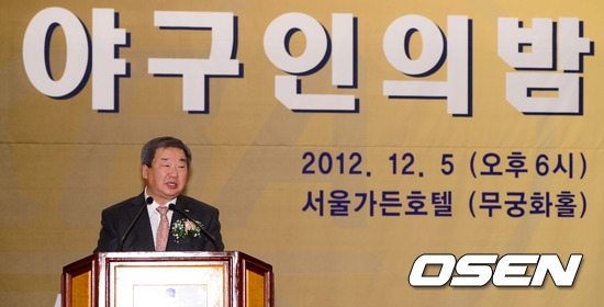 5일 오후 서울 마포구 도화동 서울가든호텔에서 열린 2012년 야구인의 밤’에서 구본능 한국야구위원회 총재가 축사를 하고 있다.