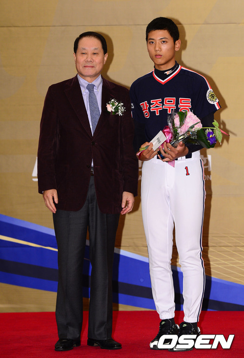 5일 오후 서울 마포구 도화동 서울가든호텔에서 열린 2012년 야구인의 밤’에서 우수선수상을 수상한 무등중학교 김현준이 기념촬영을 하고 있다.