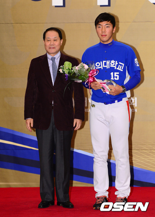 5일 오후 서울 마포구 도화동 서울가든호텔에서 열린 2012년 야구인의 밤’에서 우수선수상을 수상한 동의대학교 서용주가 기념촬영을 하고 있다.