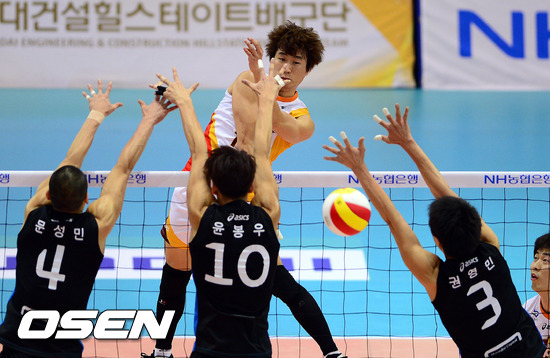 5일 오후 수원 실내체육관에서 열린 '2012-2013 NH농협 V-리그' 남자부 KEPCO와 현대캐피탈의 경기 2세트 KEPCO 김진만이 직선타를 때리고 있다.
