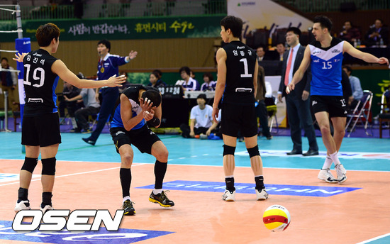 경기가 종료되고 환호하던 현대캐피탈 최태웅이 KEPOC 안젤코의 스파이크의 얼굴을 맞아 고통스러워 하고 있다. / youngrae@osen.co.kr