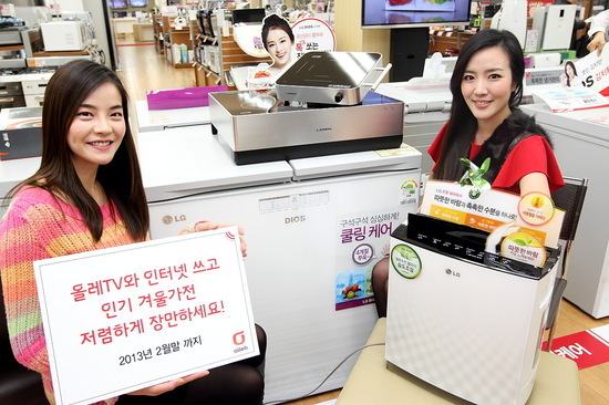 KT는 올레TV와 올레 인터넷의 동시 신규가입 이용자 대상으로 김치냉장고, 온풍에어워셔, 전기레인지를 저렴한 가격으로 제공하는 이벤트를 내년 2월 말까지 펼친다.