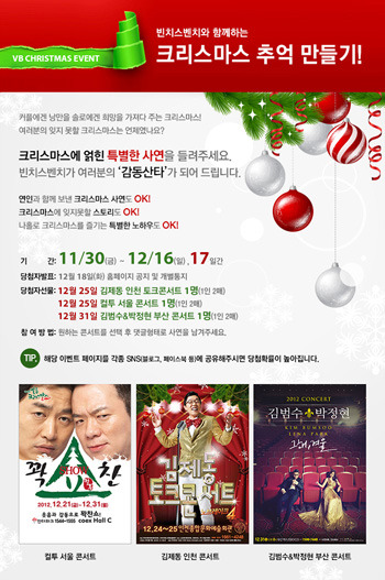 이번 이벤트는 ‘김제동 인천 토크 콘서트’, ‘컬투 서울 콘서트’, ‘김범수&박정현 부산 콘서트’ 중에서 가고 싶은 콘서트를 선택한 후 크리스마스에 얽힌 특별한 사연을 빈치스벤치 이벤트 창 댓글로 달면 응모할 수 있다.