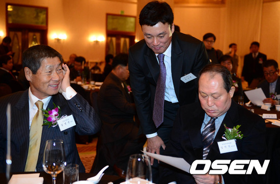 6일 오전 서울 중구 플라자호텔에서 열리는 '2012 조아제약 프로야구 대상' 시상식에서 이승엽이 김인식 감독과 김성근 감독에게 인사를 하고 있다.