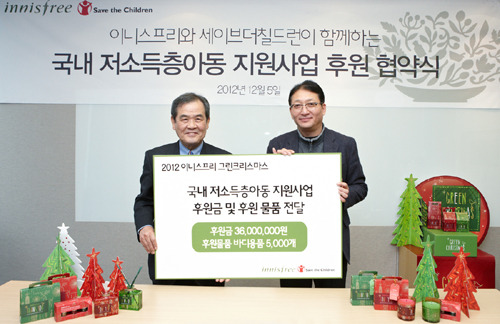협약에 근거해 이니스프리는 ‘2012 그린 크리스마스 캠페인’을 통해 적립되는 기부금 3,600만원과 이니스프리 바디제품 5,000개를 세이브더칠드런에 전달하기로 했다.