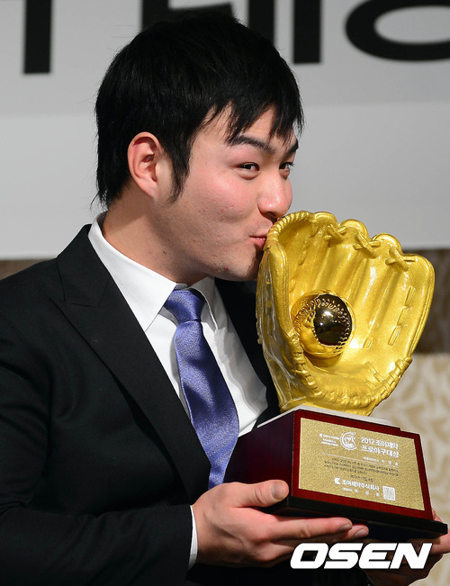 6일 오후 서울 중구 플라자호텔에서 열린 '2012 조아제약 프로야구 대상' 시상식에서 대상을 수상한 박병호가 기념 글러브에 키스를 하고 있다.