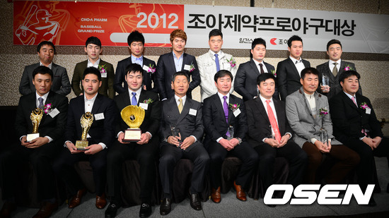 6일 오후 서울 중구 플라자호텔에서 열린 '2012 조아제약 프로야구 대상' 시상식에서 수상자들이 기념촬영을 하고 있다.
