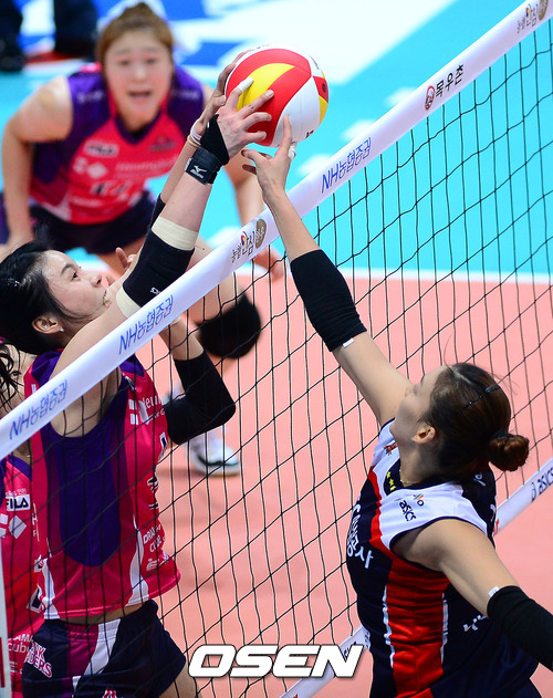 6일 오후 인천 도원체육관에서 열린 '2012-2013 NH농협 V리그' 여자부 흥국생명과 KGC인삼공사의 경기 1세트 흥국생명 김사니와 KGC인삼공사 이연주가 네트 플레이를 하고 있다.