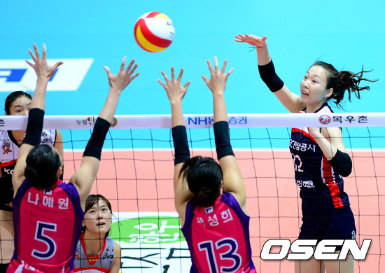 1세트 KGC인삼공사 백목화가 흥국생명 박성희, 나혜원의 블로킹을 피해 공격을 시도하고 있다. / youngrae@osen.co.kr