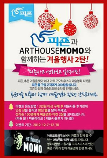 새로워진 피죤의 홈페이지를 방문해 피죤의 고농축 섬유유연제 울트라 피죤 등을 3만원 이상 구매한 소비자 중 100명에게 이화여대 예술영화 전용관 아트하우스 모모에서 관람할 수 있는 영화티켓을 증정한다.