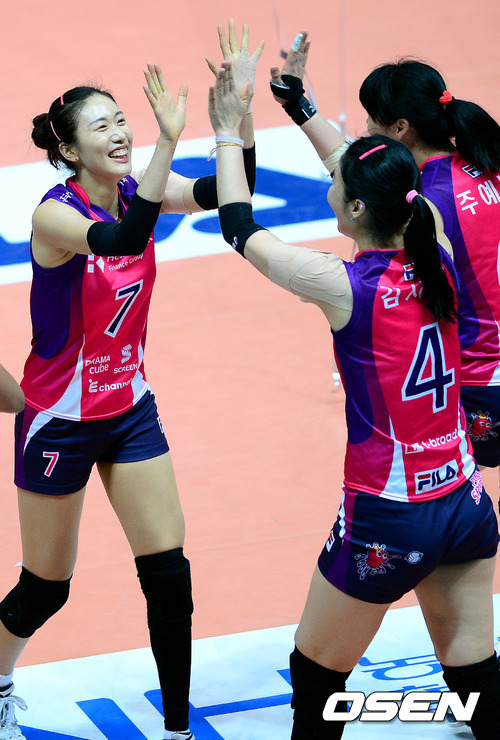 경기 종료 후 연패 탈출에 성공한 흥국생명 김혜진과 김사니가 즐겁게 하이파이브를 하고 있다. / youngrae@osen.co.kr