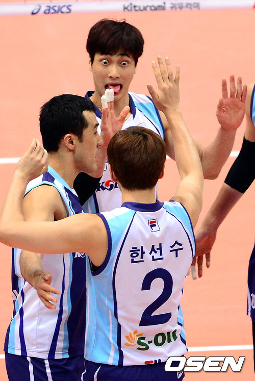 6일 오후 인천 도원체육관에서 열린 '2012-2013 NH농협 V리그' 남자부 대한항공과 삼성화재의 경기, 1세트 대한항공 김학민이 득점을 올린 후 한선수와 장난을 치고 있다.