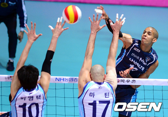 6일 오후 인천 도원체육관에서 열린 '2012-2013 NH농협 V리그' 남자부 대한항공과 삼성화재의 경기, 1세트 삼성화재 레오가 대한항공 이영택과 마틴의 블로킹을 피해 스파이크를 때리고 있다.