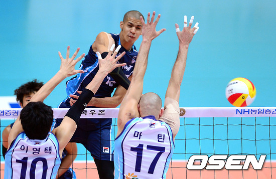 6일 오후 인천 도원체육관에서 열린 '2012-2013 NH농협 V리그' 남자부 대한항공과 삼성화재의 경기, 1세트 삼성화재 레오가 대한항공 이영택과 마틴의 블로킹을 피해 스파이크를 때리고 있다.