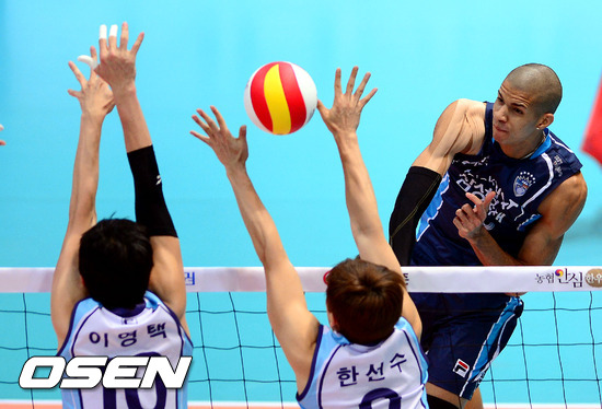6일 오후 인천 도원체육관에서 열린 '2012-2013 NH농협 V리그' 남자부 대한항공과 삼성화재의 경기, 1세트 삼성화재 레오가 대한항공 한선수, 이영택의 블로킹을 피해 스파이크를 때리고 있다.