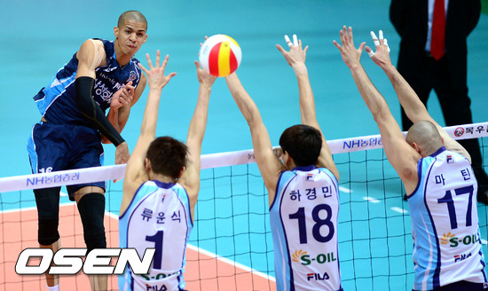 6일 오후 인천 도원체육관에서 열린 '2012-2013 NH농협 V리그' 남자부 대한항공과 삼성화재의 경기, 1세트 삼성화재 레오가 대한항공 류윤식, 하경민, 마틴의 블로킹을 뚫고 득점을 올리고 있다.