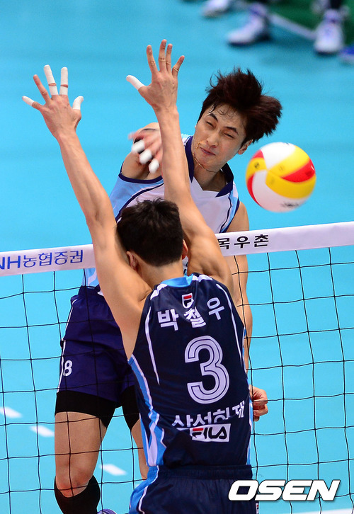 6일 오후 인천 도원체육관에서 열린 '2012-2013 NH농협 V리그' 남자부 대한항공과 삼성화재의 경기, 2세트 대한항공 김학민이 삼성화재 박철우의 블로킹을 피해 직선타를 때리고 있다.