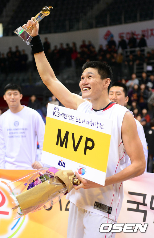 6일 오후 경기 고양시 고양체육관에서 열린 '2012 KB국민카드 프로-아마 최강전' 결승전 인천 전자랜드와 상무의 경기 MVP를 차지한 윤호영이 기념촬영을 하고 있다.