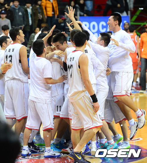 6일 오후 경기 고양시 고양체육관에서 열린 '2012 KB국민카드 프로-아마 최강전' 결승전 인천 전자랜드와 상무의 경기 종료 후 상무 선수들이 승리를 기뻐하고 있다.
