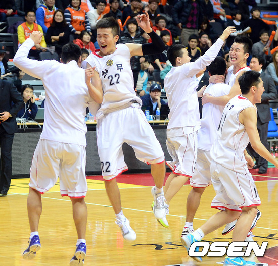 6일 오후 경기 고양시 고양체육관에서 열린 '2012 KB국민카드 프로-아마 최강전' 결승전 인천 전자랜드와 상무의 경기 종료 후 상무 선수들이 승리를 기뻐하고 있다.