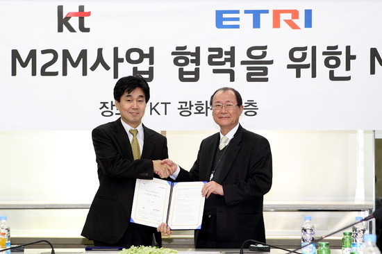 KT와 ETRI(한국전자통신연구원)가 5일 KT 광화문 사옥에서 사물간통신(M2M) 기술 협력과 사업화를 위한 양해각서(MOU)를 체결했다.