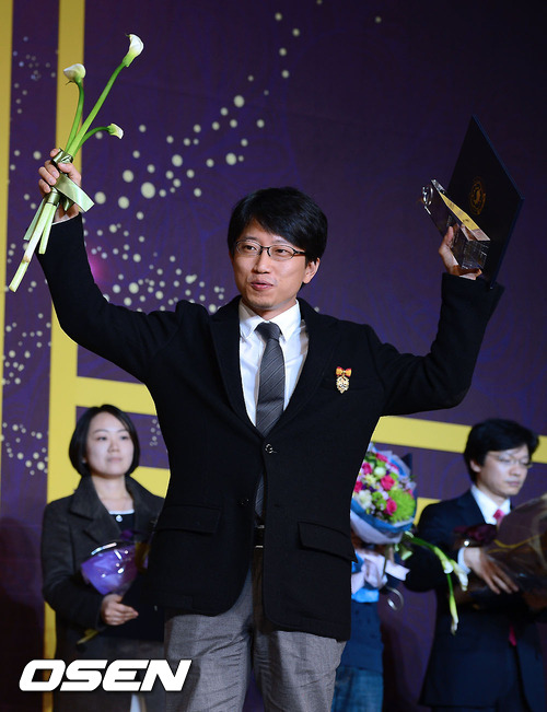 7일 오후 서울 강남 삼성동 코엑스 그랜드볼룸에서 열린 '2012 대한민국 콘텐츠 대상'에서 대통령 표창을 수상한 장태유 PD가 두 팔 벌려 환호하고 있다.