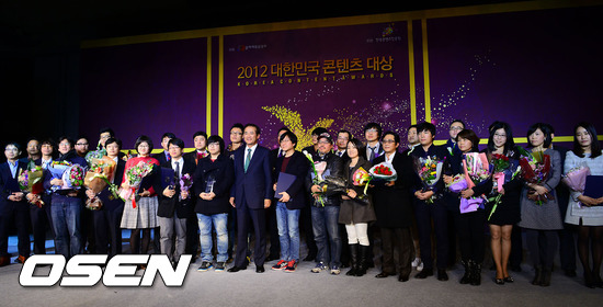 7일 오후 서울 강남 삼성동 코엑스 그랜드볼룸에서 열린 '2012 대한민국 콘텐츠 대상'에서 수상자들이 포토타임을 갖고 있다.