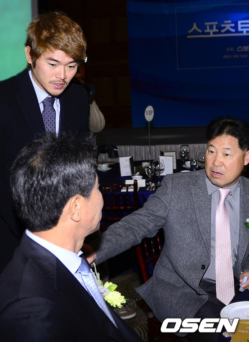 7일 오후 서울 강남구 논현동 임피리얼 팰리스 호텔에서 열린 '2012프로야구 스포츠토토 올해의 상' 시상식에서 두산 노경은이 SK 이만수, 롯데 김시진 감독과 인사를 나누고 있다.