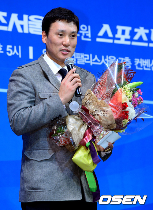 7일 오후 서울 강남구 논현동 임피리얼 팰리스 호텔에서 열린 '2012프로야구 스포츠토토 올해의 상' 시상식에서 올해의 타자상 선정된 삼성 이승엽이 수상 소감을 전하고 있다.